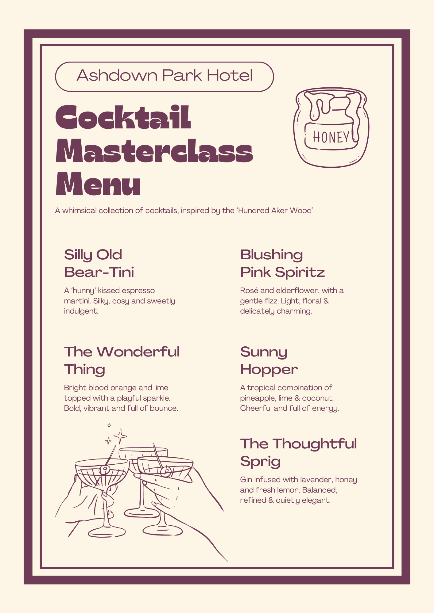 Celebrate World Cocktail Day as part of our 100 Years of Winnie-the-Pooh celebrations with The Hunny Pot Cocktail Masterclass at Ashdown Park Hotel.